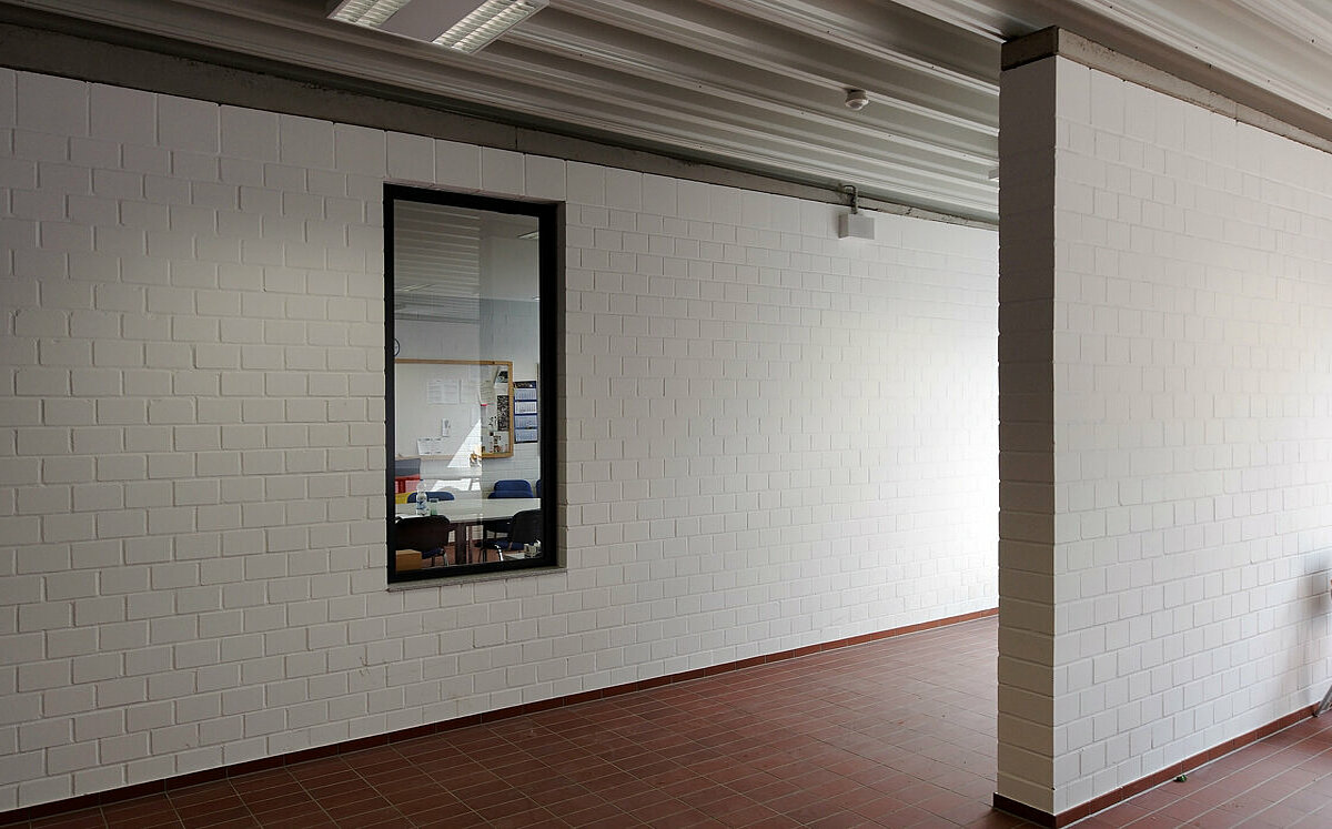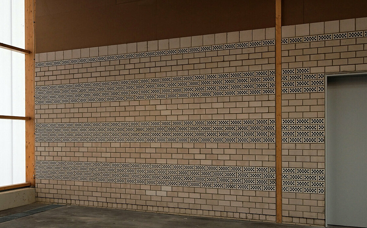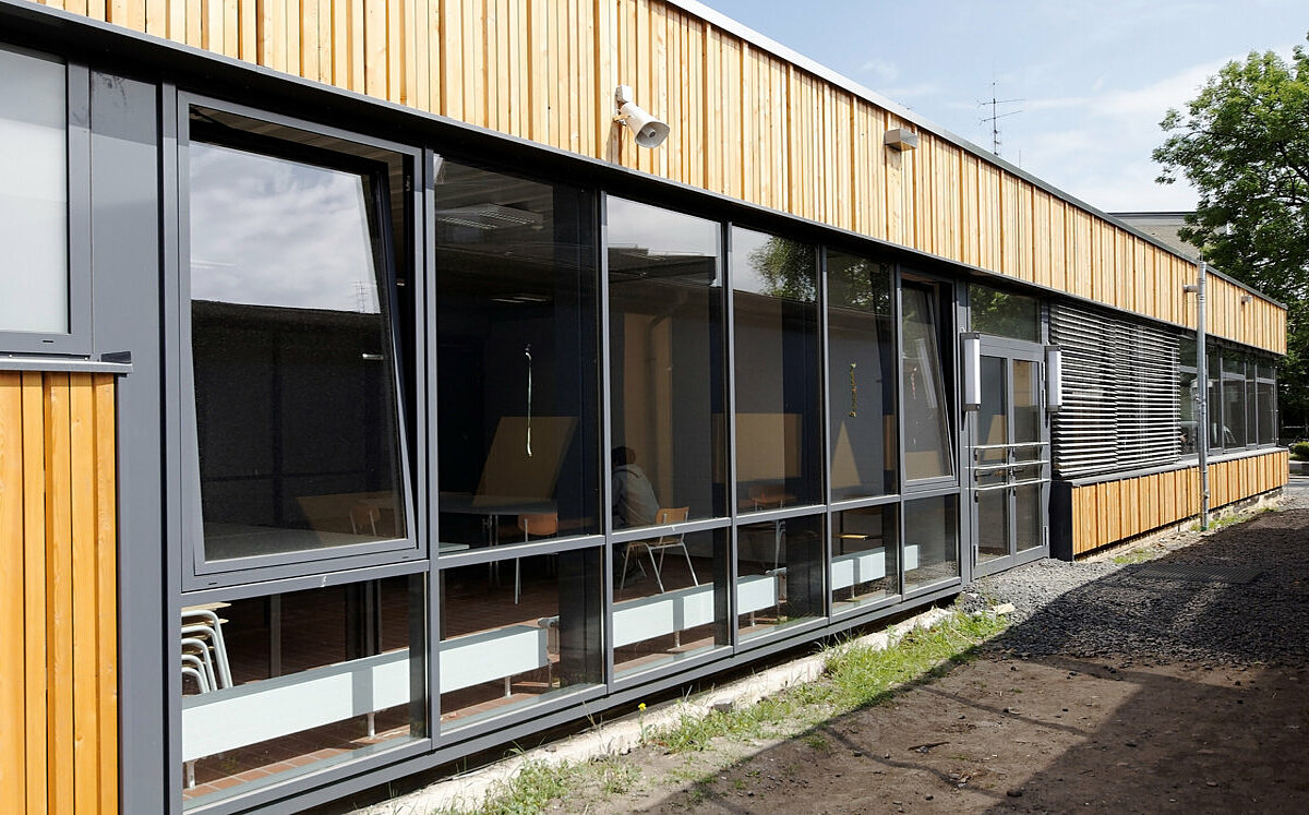 Der Wandaufbau des Nebengebäudes besteht aus einem Kalksandsteinmauerwerk als Sichtmauerwerk im Innenraum und ist nach außen gedämmt und mit einer Holzverkleidung versehen.