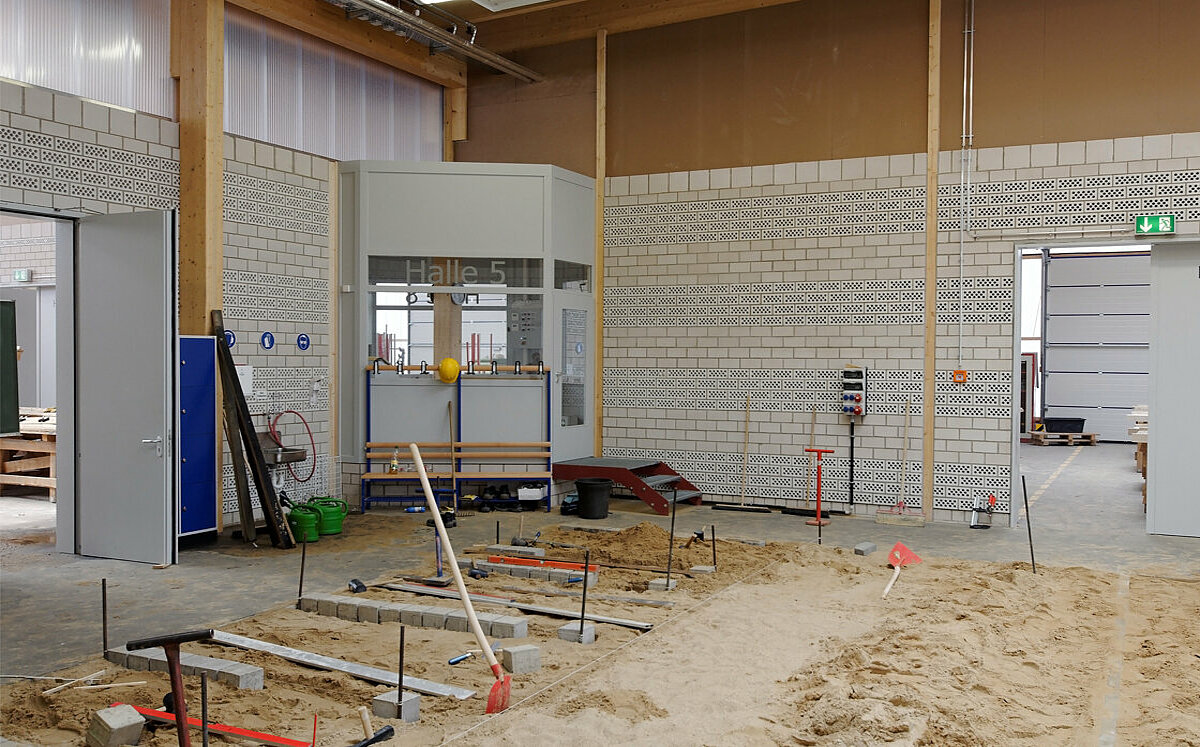 Die Fachpraxishalle umfasst 8 Werkstätten, Maschinenraum, Lager, Unterrichtraum, Lehrerzimmer und Pausenzone sowie dazugehörige Nebenräume. In den Werkstätten werden beispielsweise zukünftige Maurer, Dachdecker oder Zimmerer ausgebildet.