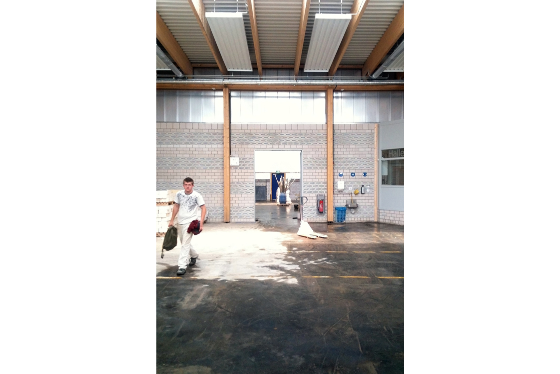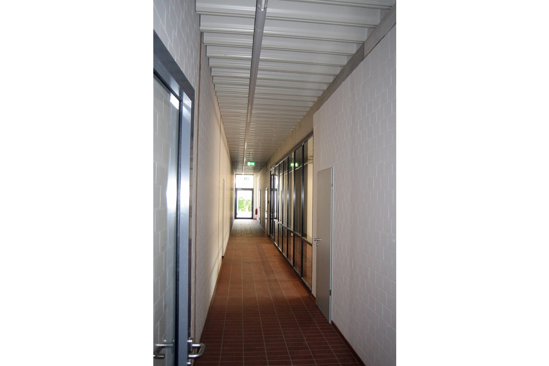 Die neue Fachpraxishalle ist in Holzskelettbauweise errichtet. Lichtdächer und -bänder belichten die innere Zone der Halle. Die Fassade der Halle ist mit einer Polycarbonat-Stegplatte bekleidet.