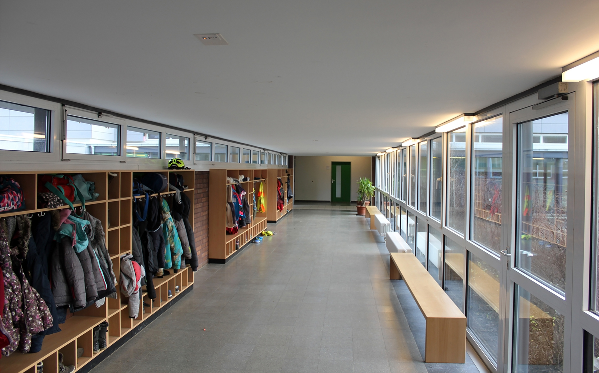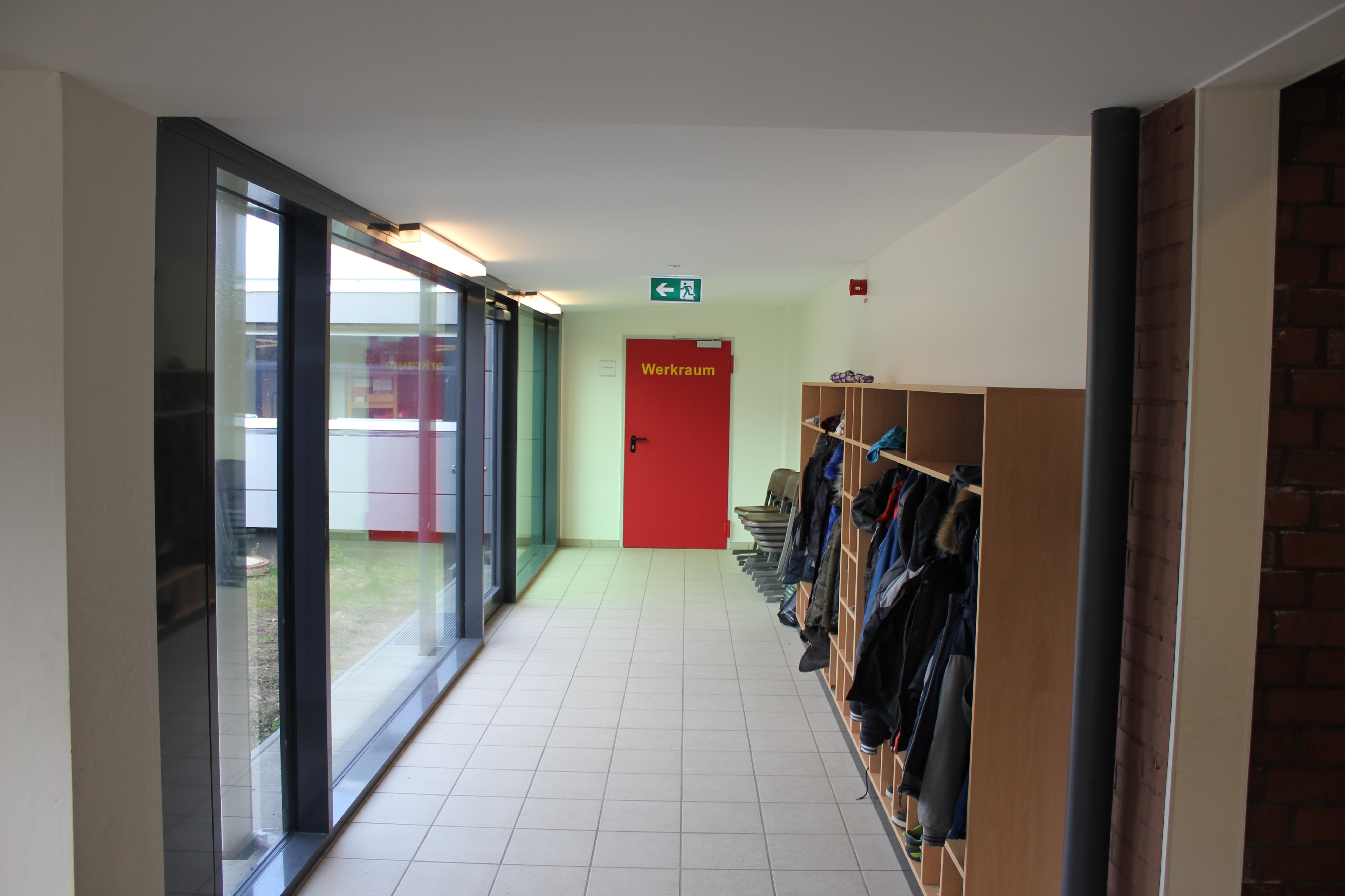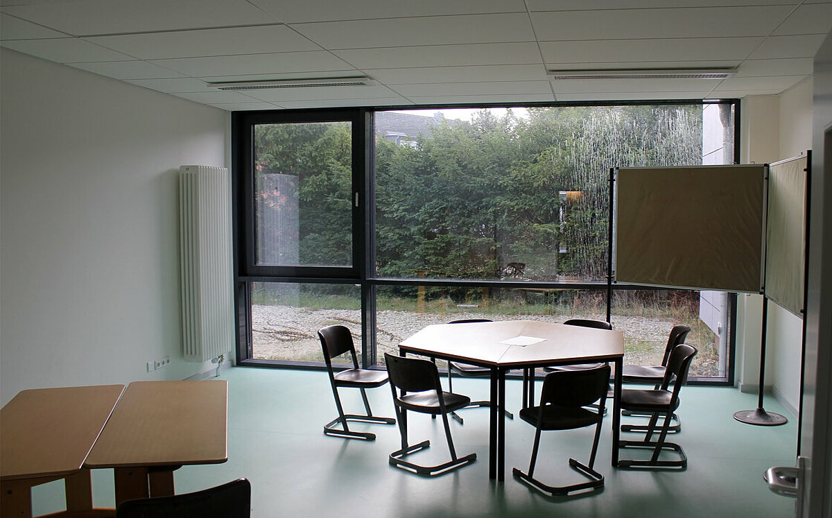 Klassenräume, ein Werkraum und eine Mensa mit Nebenräumen sind neu errichtet und die Verwaltung in einem Gebäudeteil konzentriert. Die Umkleideräume und Duschen der Sporthalle sind komplett neu strukturiert.