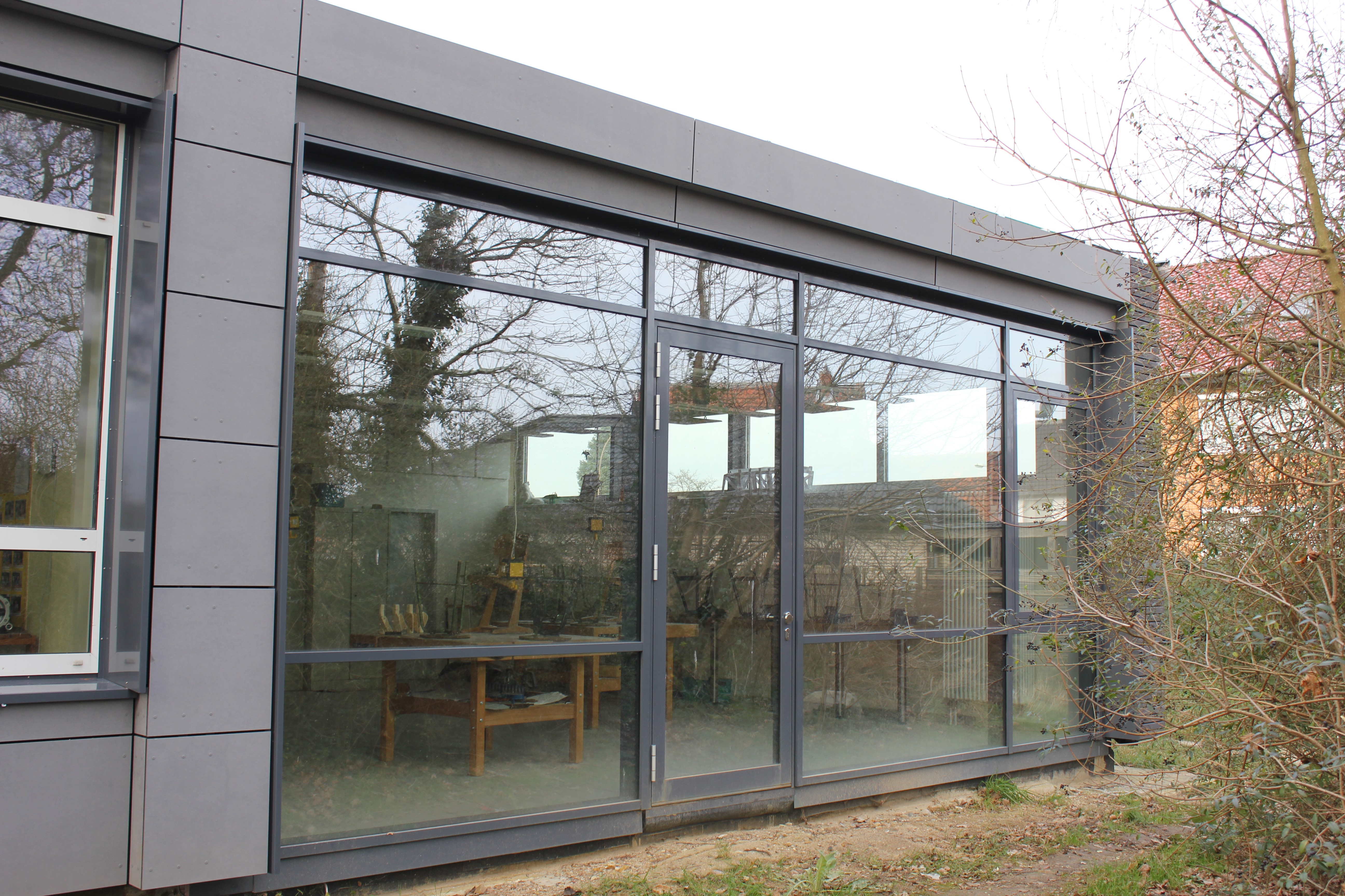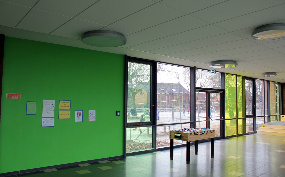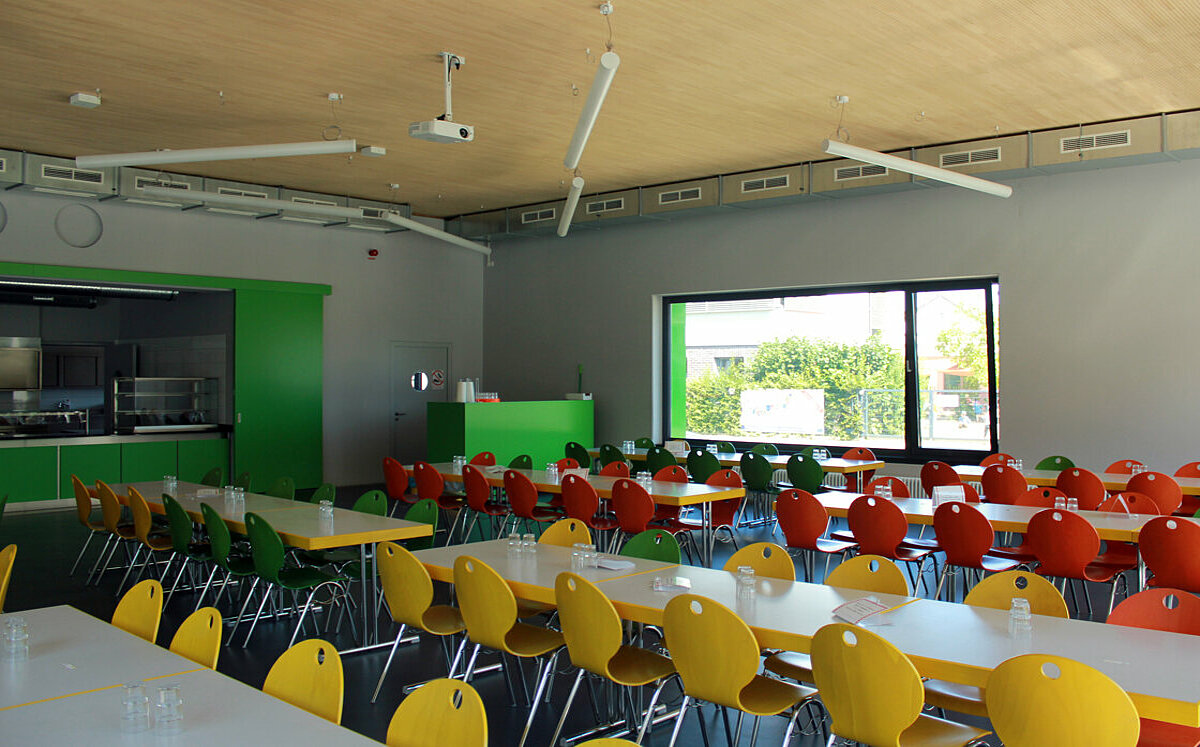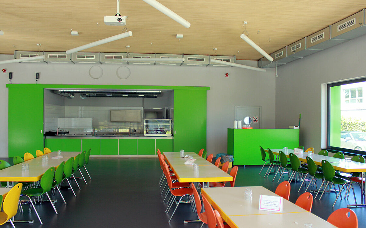 Klassenräume, ein Werkraum und eine Mensa mit Nebenräumen sind neu errichtet und die Verwaltung in einem Gebäudeteil konzentriert. Die Umkleideräume und Duschen der Sporthalle sind komplett neu strukturiert.