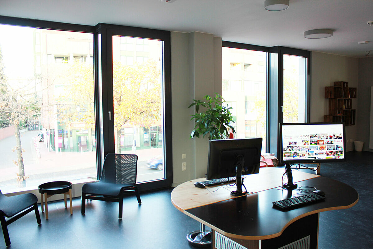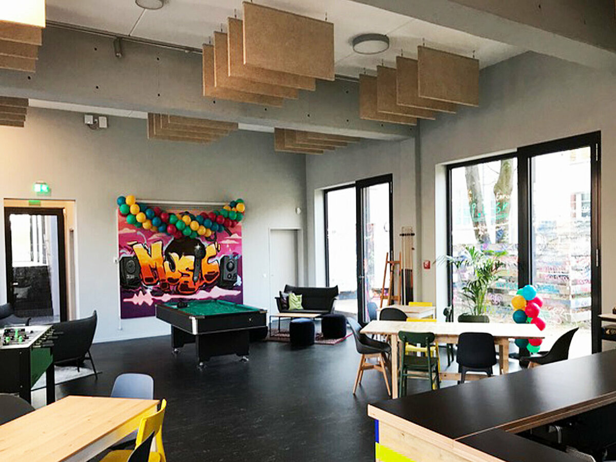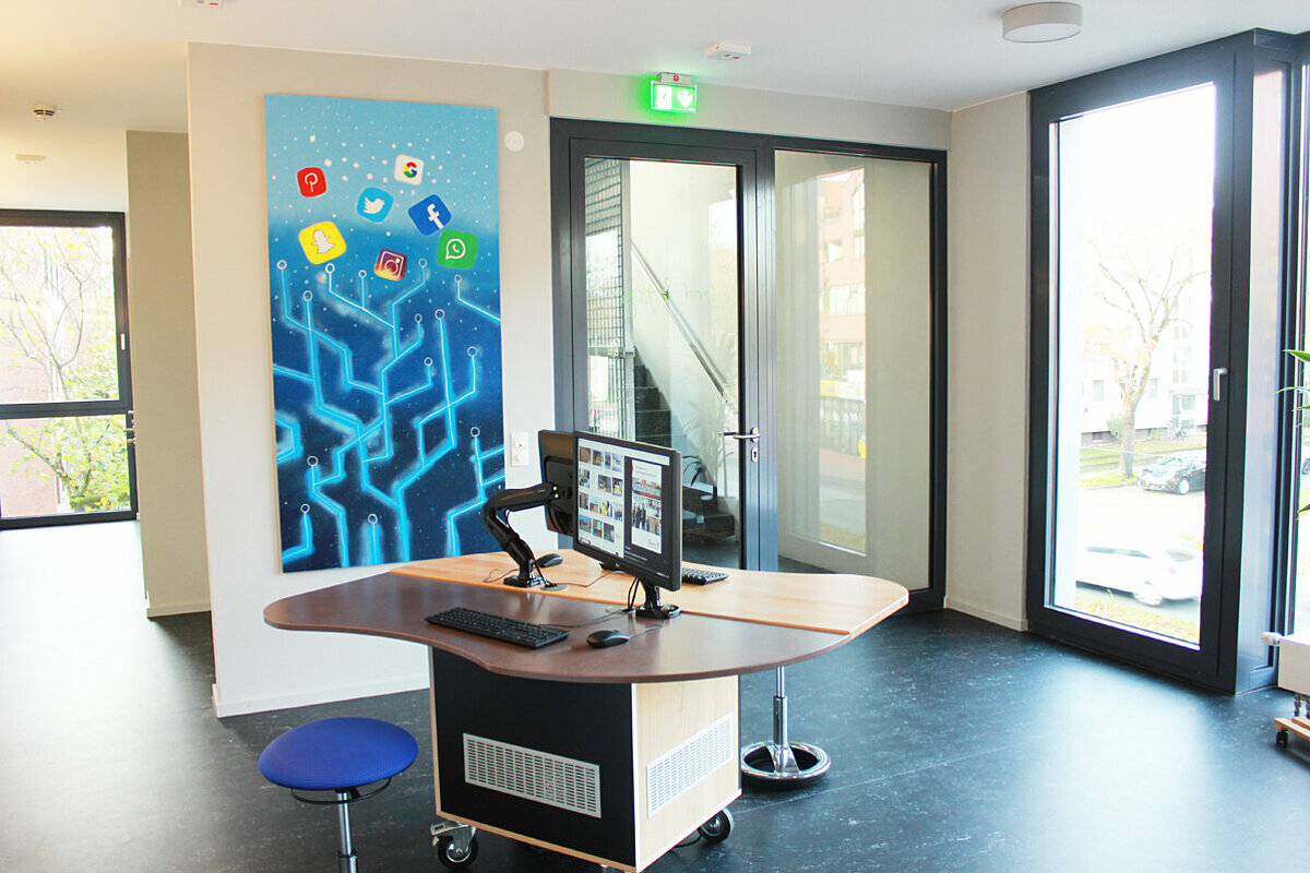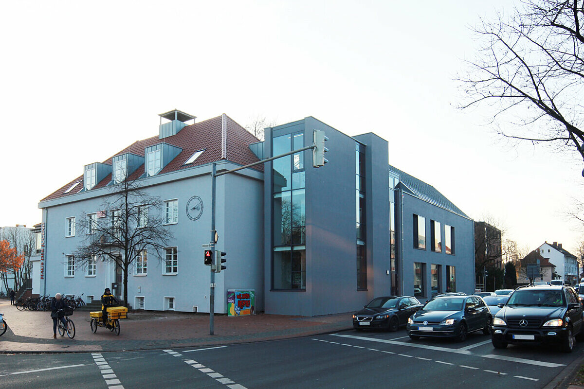 Der Mitteltrakt des ehemaligen, dreigliedrigen Rathauses ist in seinem äußeren Erscheinungsbild erhalten und umfangreich saniert. Um Barrierefreiheit und zusätzliche Fluchtwege zu ermöglichen, ist der vorhandene Nordtrakt durch einen Neubau mit Verbindungsbau ersetzt. Im neuen Verbindungsbau befindet sich der öffentliche Eingang mit Treppenhaus und Aufzug, durch die beide Gebäudeteile erschlossen werden. Neu entstanden sind unterschiedliche Gruppenräume und ein Café, Interneträume, ein Tonstudio und Büros.
